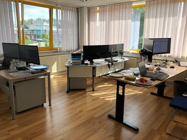 Die Bürofläche hat eine Gesamtgröße von ca. 180 m², aufgeteilt in 4 separate Büroräume sowie eine Lagerfläche / Archivraum. Zwei ca. 30 m² große Büroräume haben eine lange Fensterfront nach Osten hin. Zwei weitere Büroräume mit ca. 24 m² und 29 m² verfügen über Fenster nach Süden.