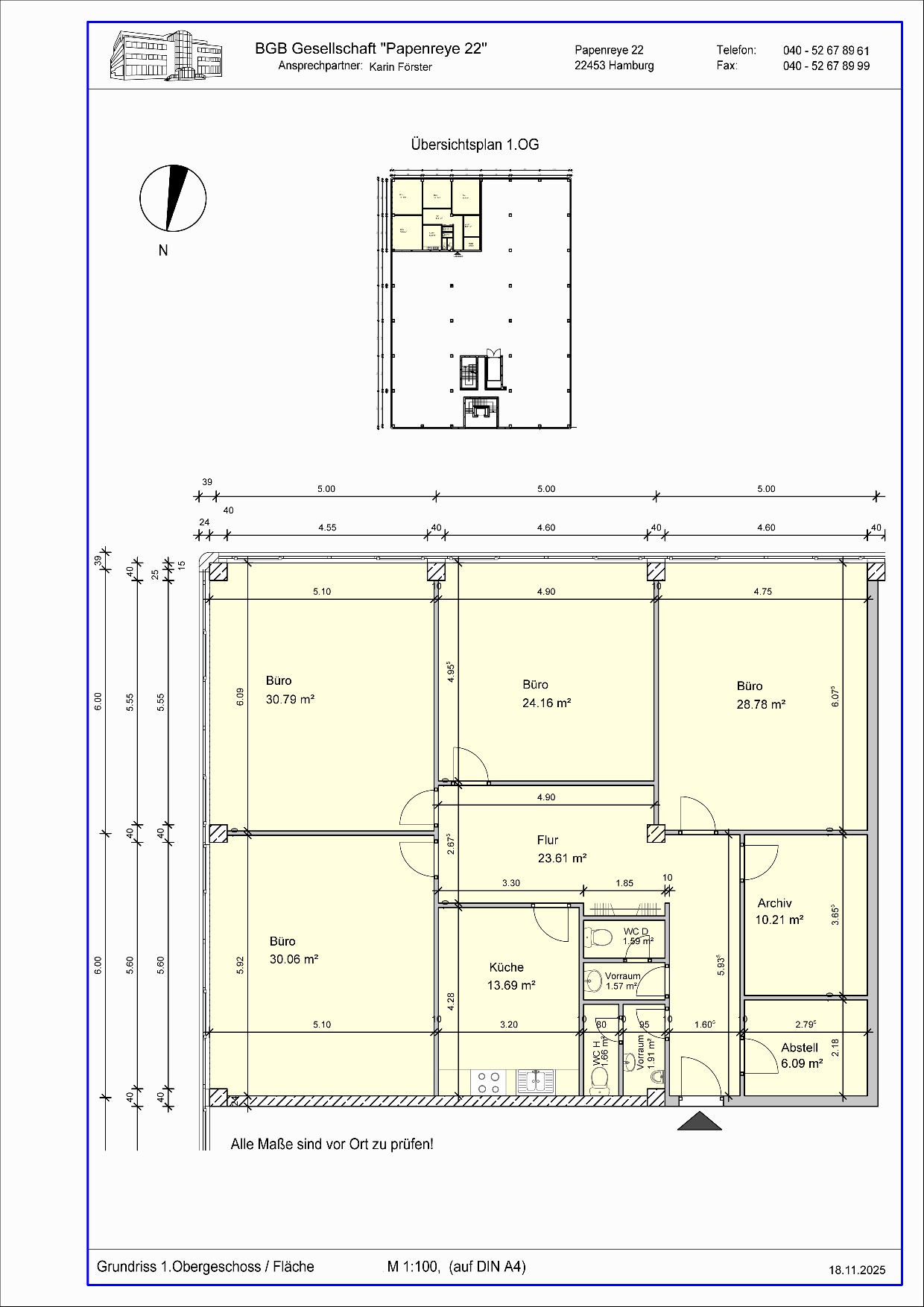 Weiterhin besitzt die Fläche einen Eingangsflur, getrennte WC-Anlagen, eine Küche mit ca. 13,70 m², einen Abstellraum und einen ca. 10 ² großen Archivraum/Lagerfläche.